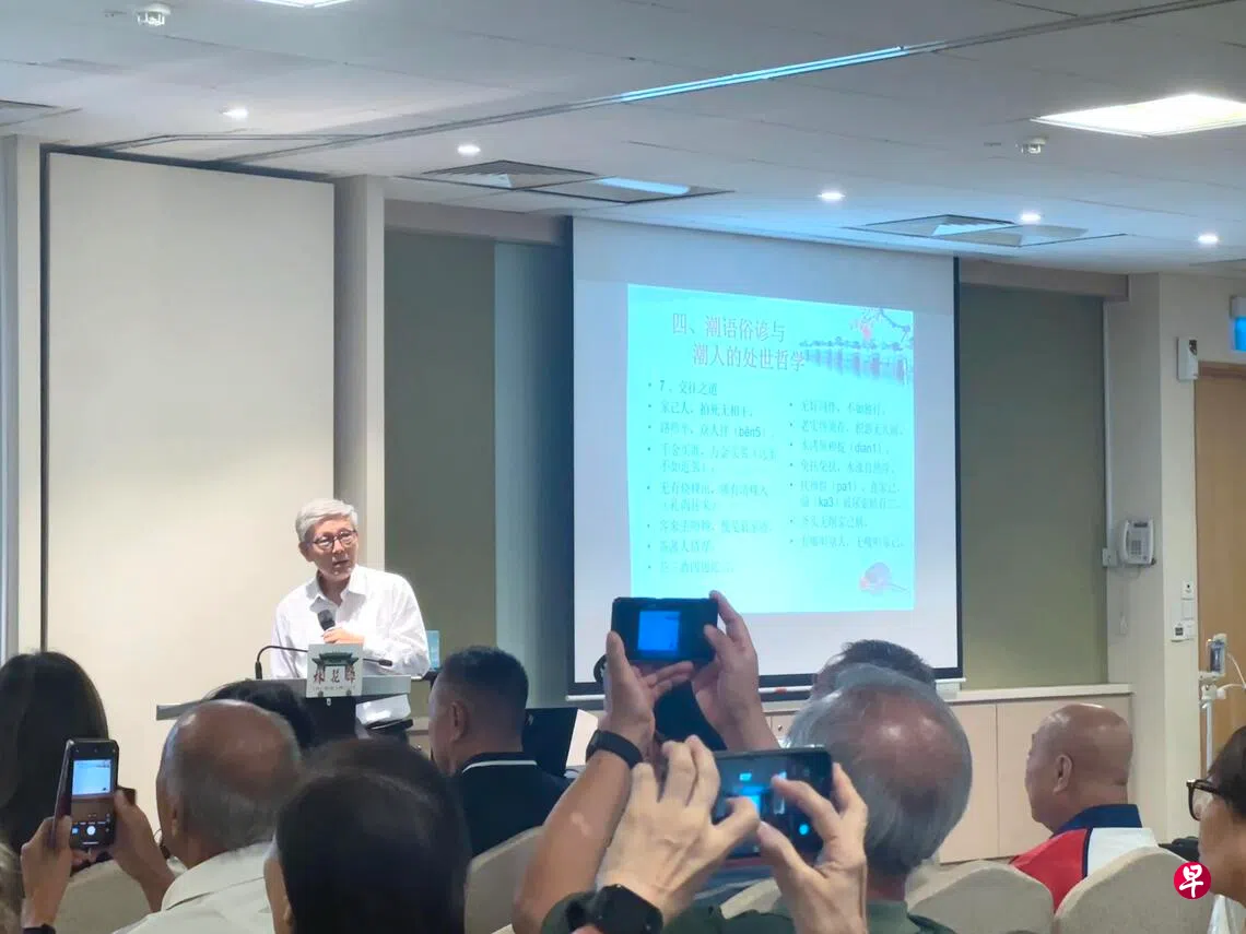 他在题为“潮语俗谚与潮人的生活智慧和处世哲学”讲座中,向100多名参与者阐述潮州人和潮州话的历史,以及潮汕方言在保留古音、古词语上的重要意义。