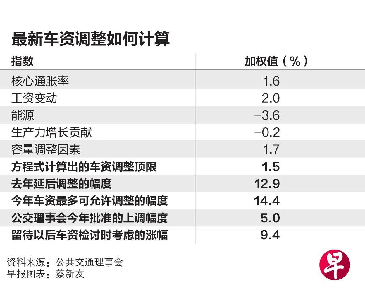 两家公交业者SMRT和新捷运都因相似的成本压力缘由,包括维修成本上涨、公交乘客量因灵活工作安排尚未恢复到冠病疫情前的水平、以及劳动市场竞争加剧等,申请将车资上调14.4%,即这一轮车资最多可允许调整的幅度。不过,公交理事会只批准调高5%。