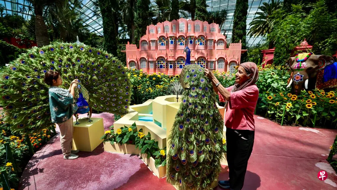 为配合花展的开幕,滨海湾花园星期四(10月16日)邀请新加坡印度人发展协会的长者共同创作两座孔雀雕塑。67岁的阿吉特·考尔在本地女帽设计师与工匠郭惠旻的带领下,为孔雀雕塑的每片羽毛眼部镶嵌玻璃珠,并固定在孔雀尾部羽毛上。