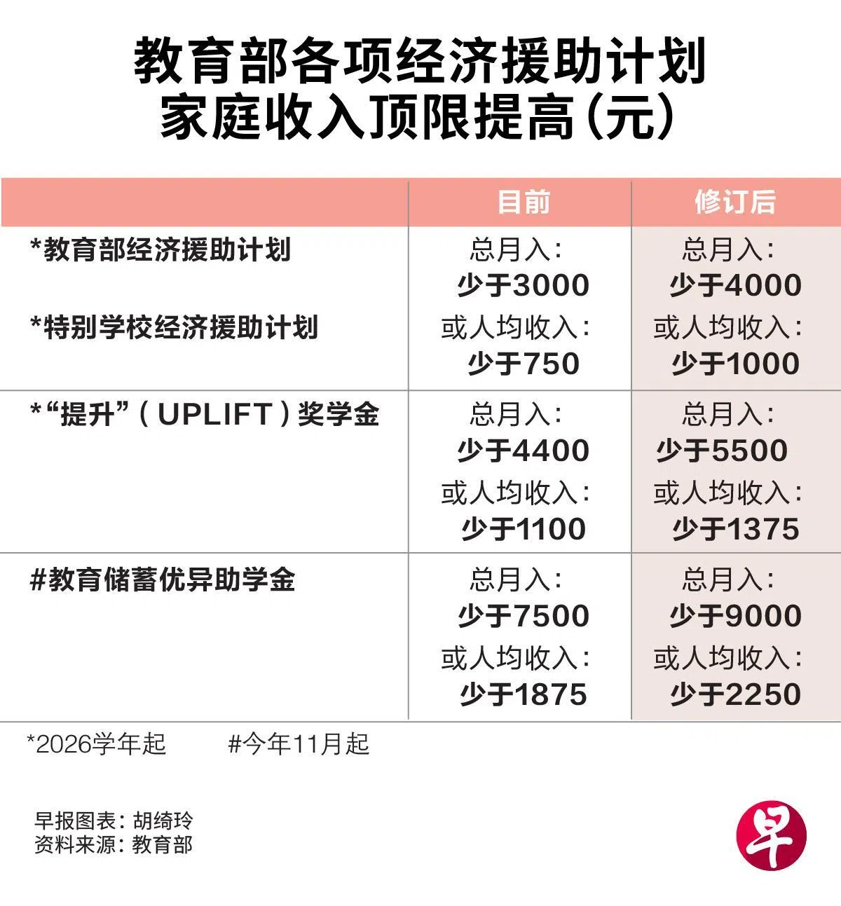为了帮助更多中低收入家庭的学生应对教育开支,教育部宣布提高各项经济援助计划的家庭收入顶限,同时调高多项助学金额度,包括增加校车费补贴。这将让受惠学生增加3万1000名,使得受惠学生总数每年约达13万3000人。