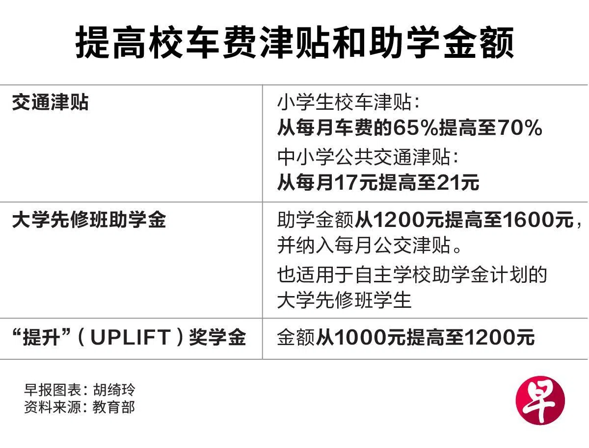这包括提高校车的交通补贴,小学生的校车费补贴由每月的65%提高至70%,中小学生的公共交通补贴,也由每月17元增至21元。
