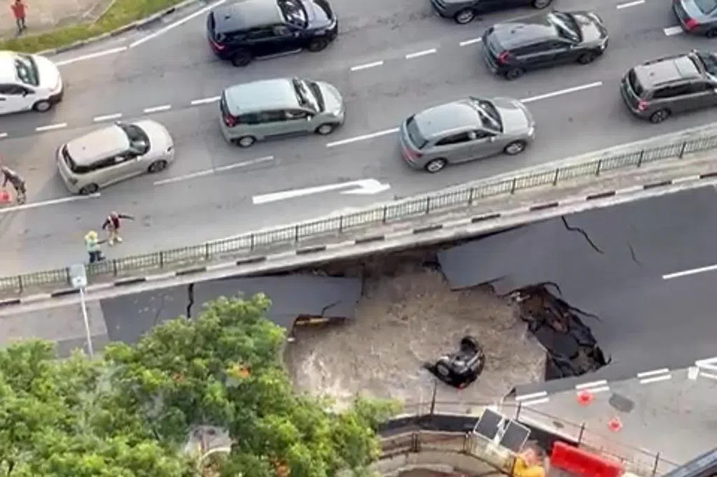 《联合早报》记者抵达现场后发现,事发路段新铺的柏油路出现一个坑洞。记者目测坑洞深约15厘米、长约1米,沥青破碎掉落。一辆德国品牌大众夏朗车款(Volkswagen Sharan)停在坑洞前方,右侧的前后轮都爆胎,一对男女在一旁等待当局处理。现场放置四个橙白相间的路锥,警示其他车辆绕行。事发路段并没有出现交通拥堵情况。