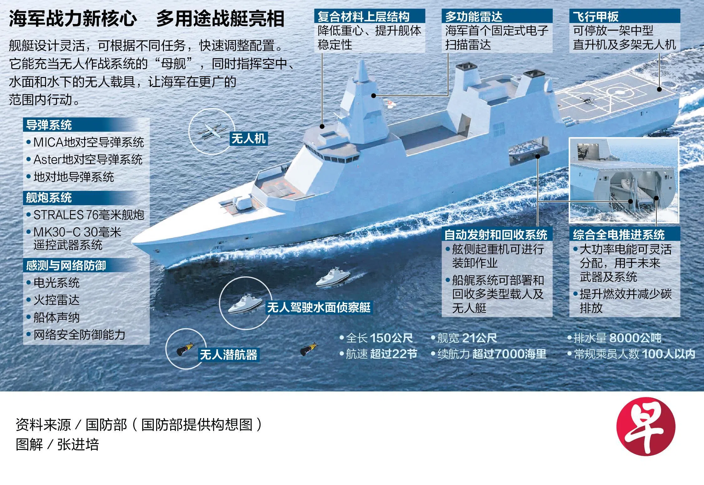 这艘结合现代护卫舰战力与无人系统操控功能的新型多用途战艇(Multi-Role Combat Vessel),是我国海军至今建造规模最大、系统最复杂的战舰。