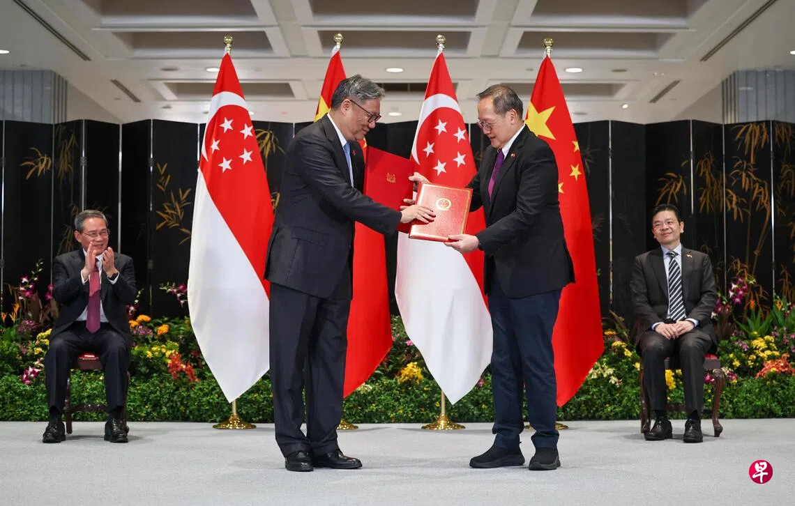 中国国务院总理李强和我国总理黄循财星期六(10月25日)在国会大厦,共同见证新中在绿色发展、数码经济及人力培训与发展等领域,签署和更新八份谅解备忘录。