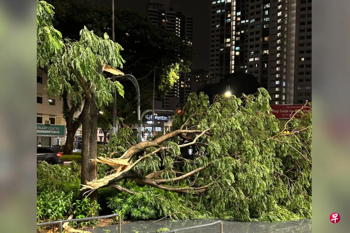 从读者所提供的照片中,能看到当时一棵约有两层楼高的大树,因树干断裂而倒在行人道上。