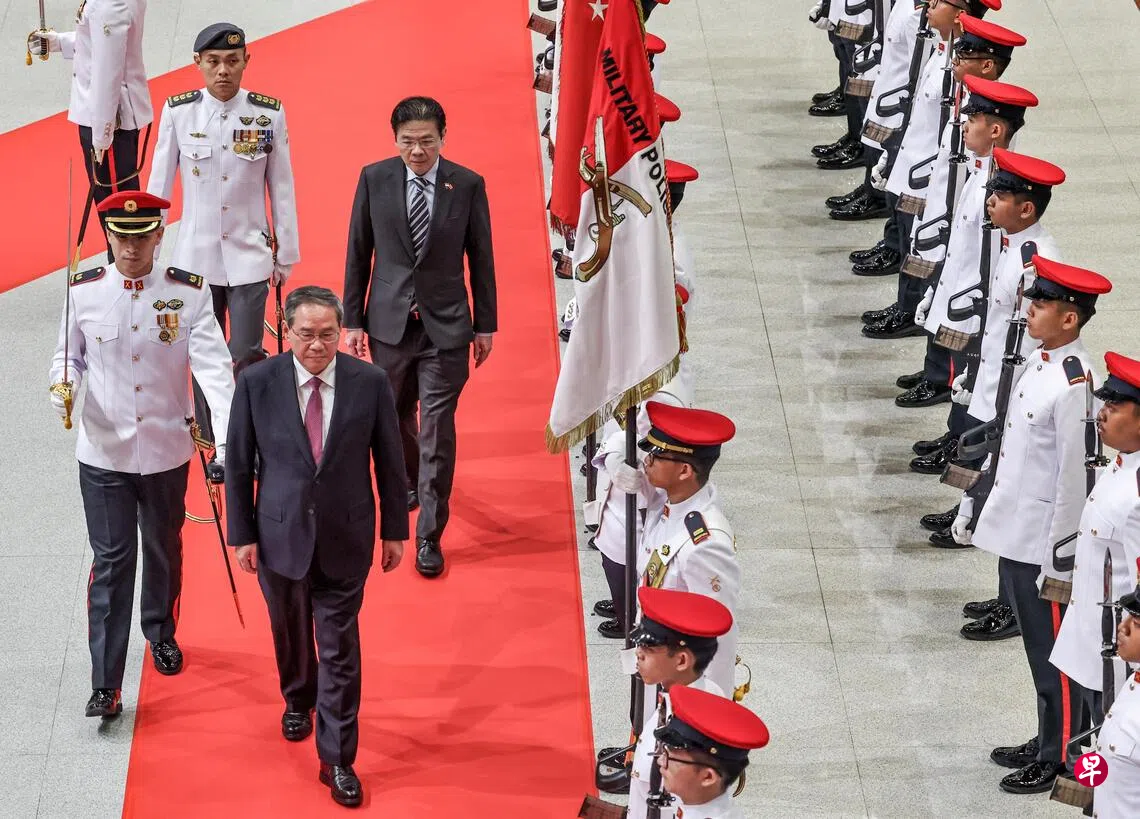 中国总理李强首次以总理身份访新,五位中国正部级高官陪同。李强在抵达新加坡后发表书面讲话,形容新中建交35年,“成为互学互鉴、互利共赢的典范”。