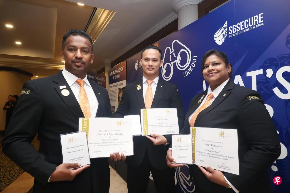 这三名高级保安员——方伟发(32岁)、玛拉(Malar Muniandy,43岁)和库纳(Nadarajah Kuna Prakash,42岁)在星期一(10月27日)举行的“年度酒店保安奖”颁奖典礼上,获得“警惕奖”。