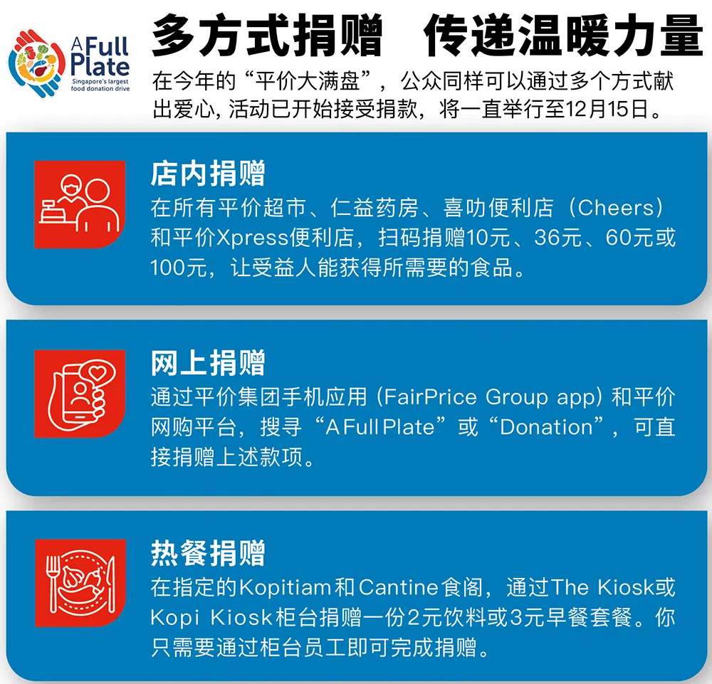 由平价集团推出的“平价大满盘”是新加坡历来规模最大的食品捐赠活动。今年的活动已在10月15日正式启动,将一直进行至12月15日。