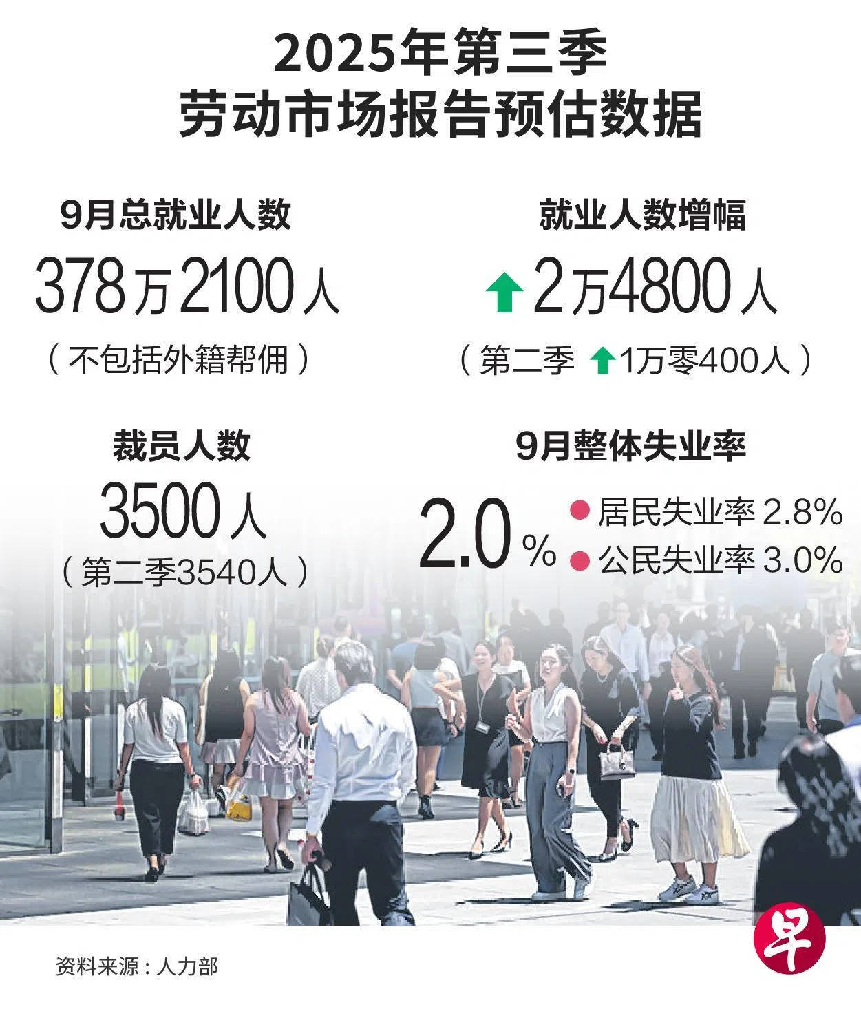 人力部星期四(10月30日)公布2025年第三季劳动市场报告预估数据。当中就业人口增加近2万5000人,比今年第二季的1万零400人多了近1.5倍,也比去年第三季的2万2300人多。