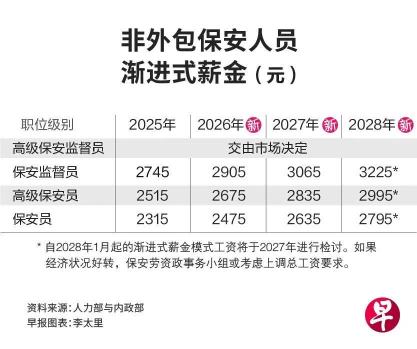 人力部与内政部星期四(10月30日)宣布,政府接受保安劳资政事务小组(Security Tripartite Cluster)所提出的保安业渐进式薪金模式(Progressive Wage Model)建议。根据这个模式,从2026年1月1日起,约1500名全职非外包保安员的工资将至少提高至2475元,和新入职人员的起薪一样。未来三年,他们的基本月薪也会逐年增加160元,2028年将增至2795元。