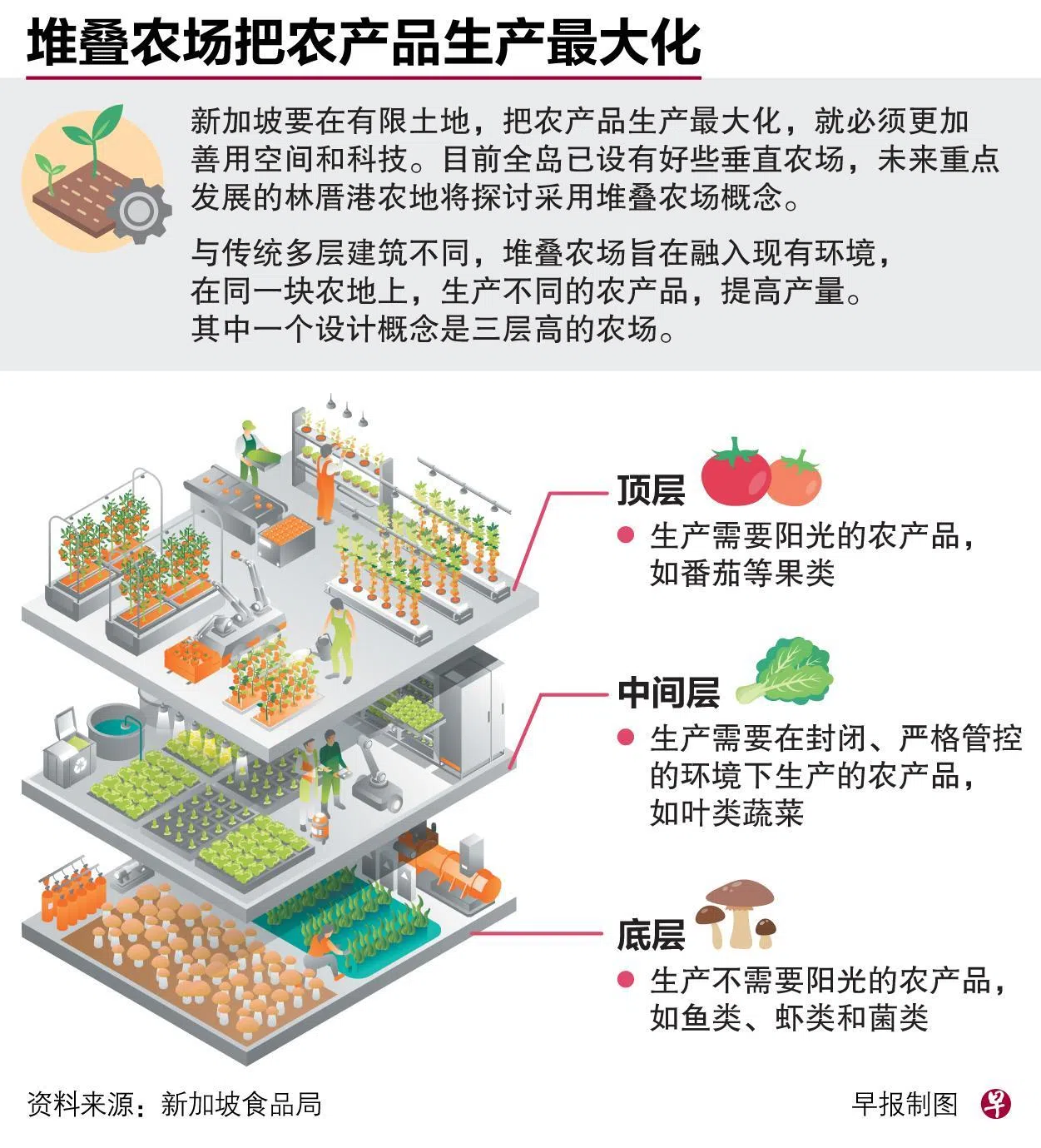 业者可在底层养殖不需要阳光的农产品,如鱼虾类和菌类;中间层留给需要在严格管控的封闭环境下生产的农产品,如叶类蔬菜;顶层则生产需要阳光的农产品,如番茄等果类。