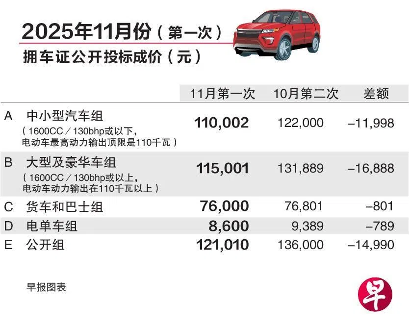 11月首轮拥车证公开投标活动星期三(11月5日)下午结束,应对大众市场需求的中小型汽车组(A组)成价下跌1万1998元(-9.8%),报11万零2元,接近9月首轮10万7889元的价位。
