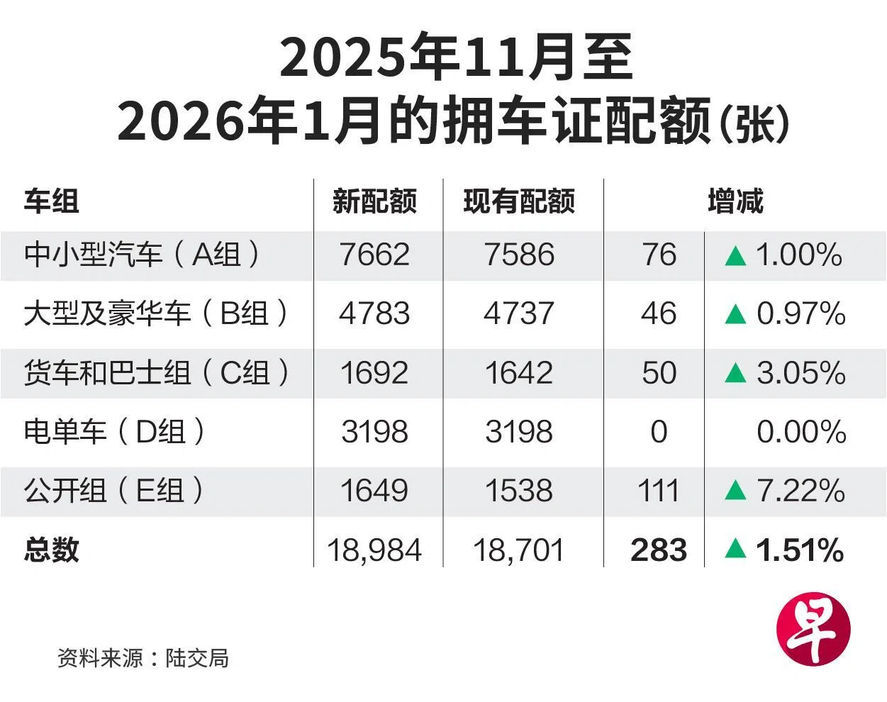 陆路交通管理局10月24日公布,11月至明年1月的可供投标的拥车证总配额增1.51%,共计1万8984张,与8月至10月的1万8701张相比,多283张。