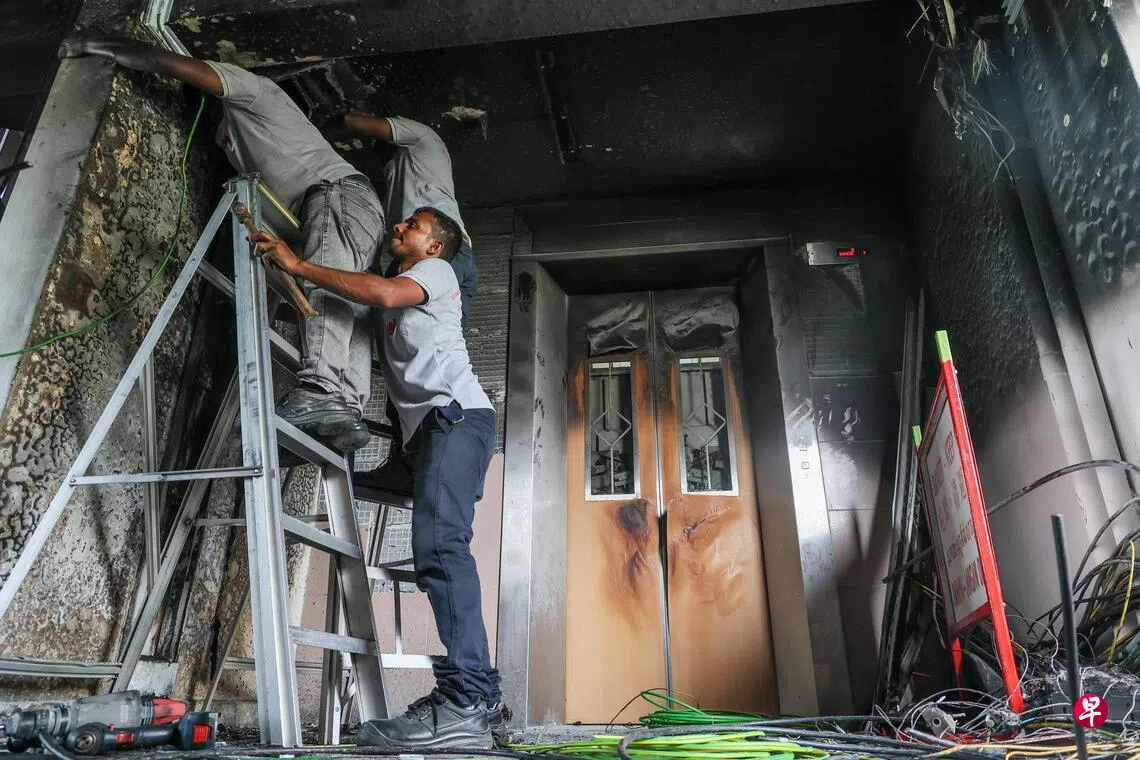 《联合早报》记者星期三(5日)下午走访现场时发现,八楼电梯口的墙壁已被熏得焦黑一片,烟熏痕迹一直延伸到两三个单位外,电梯无法操作,三四名维修工人忙着在电梯口抢修电线。