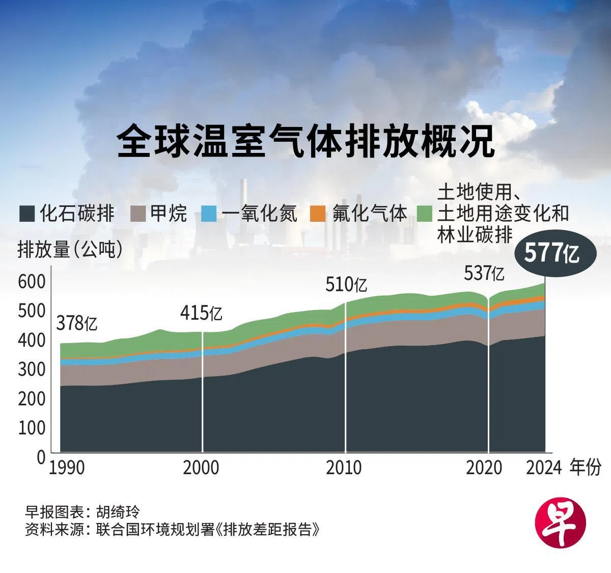 全球去年排放的温室气体达577亿公吨,比前年增加2.3%,增速是2010年代年均的五倍多。预计到2030年代初,全球气温升幅将超出人类设定的1.5摄氏度控制目标。