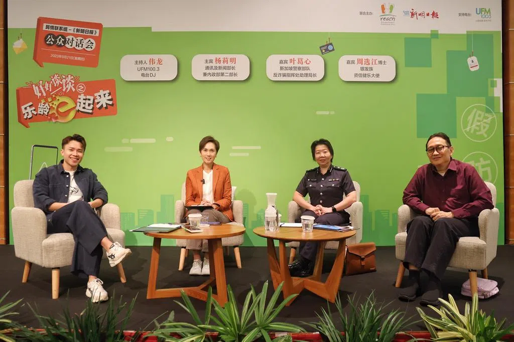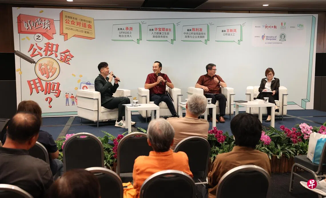 11日傍晚在新达新加坡会展中心举行的对话会,由UFM100.3广播员张承尧主持,对谈嘉宾除了许宝琨,还有中央公积金局副局长(政策与企业发展群)陈利发,以及公积金义工王新凤。出席的公众约有100人。
