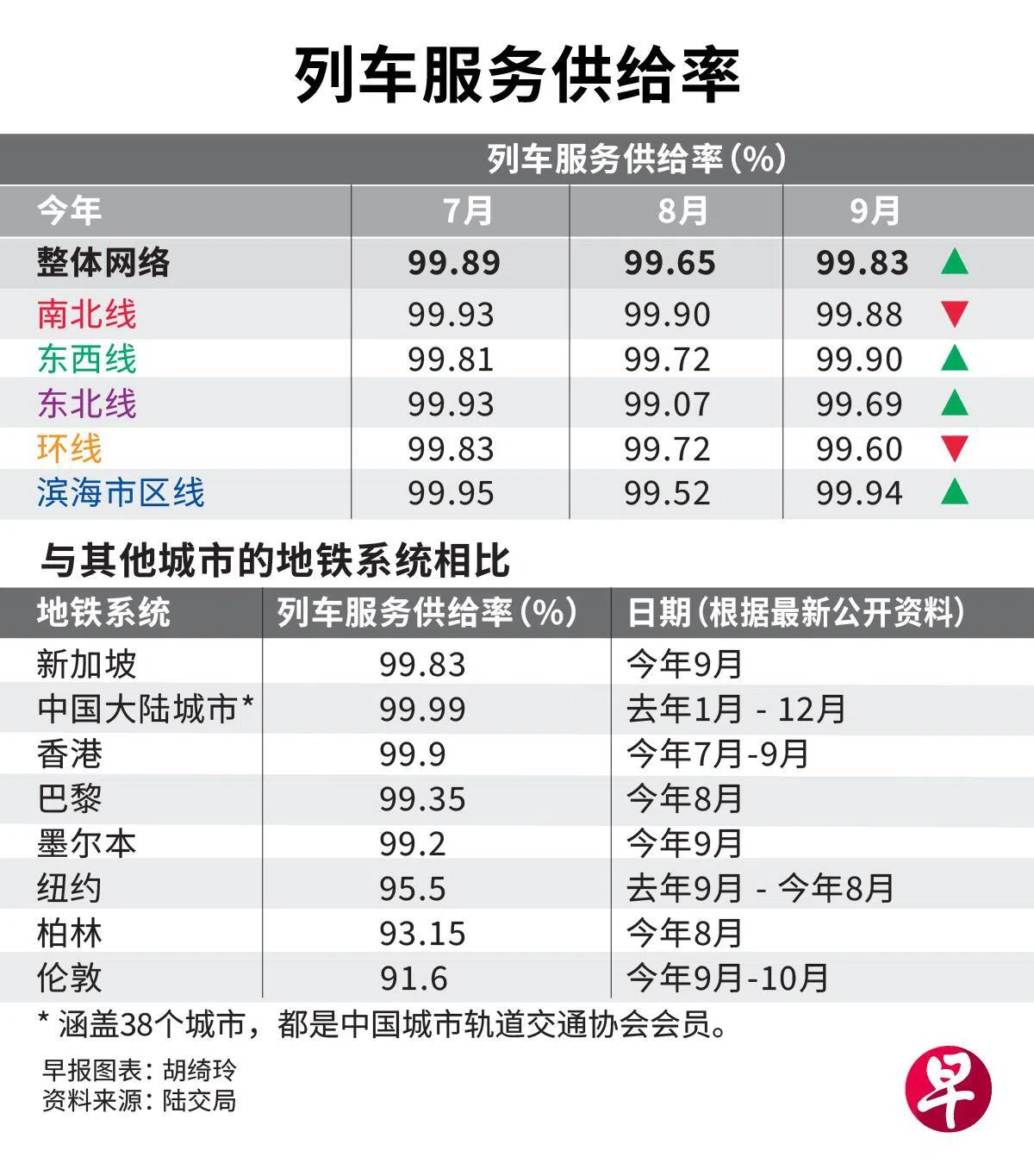 今年7月至9月间,整体地铁网络的列车服务供给率维持在99%以上,9月达99.83%;各地铁线的供给率介于99.60%至99.94%。由于汤申—东海岸线还未全线通车,陆交局未列入这条地铁线的数据。