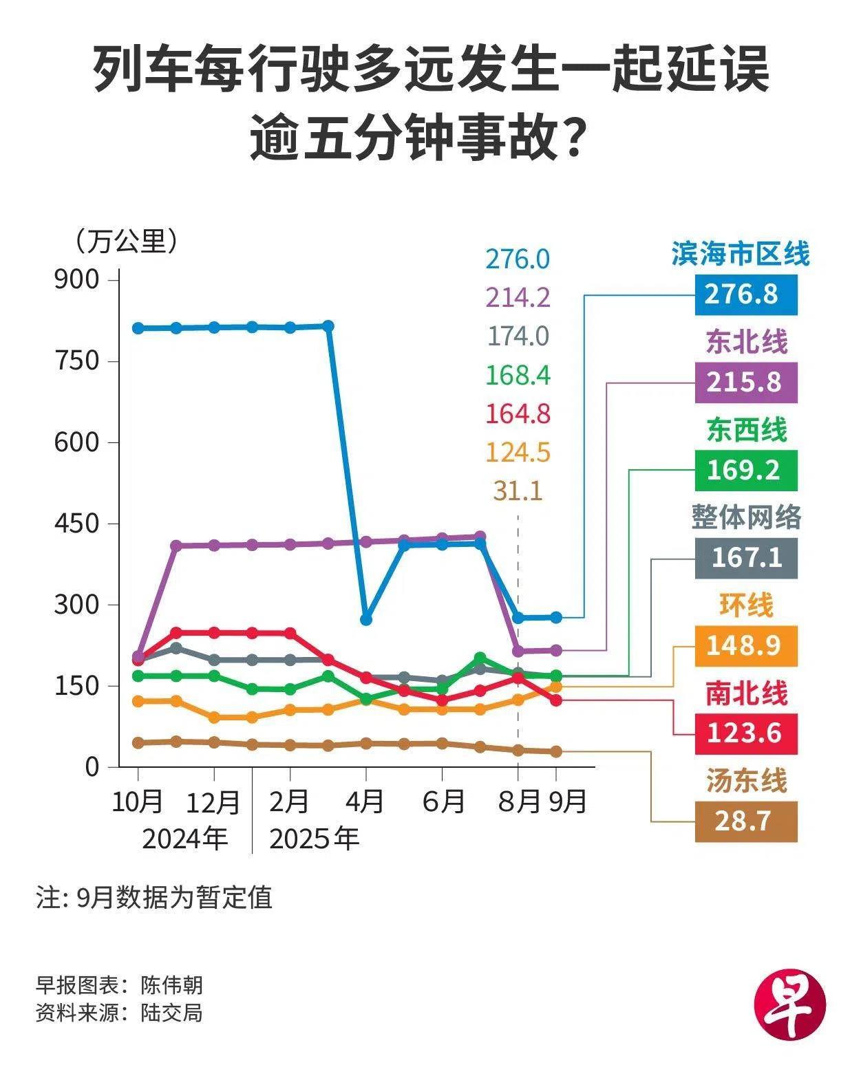 还未全线通车的汤申—东海岸线,仍处于分阶段建设与系统整合阶段,营运里程较短,对单次延误事故的影响更敏感,因此12个月移动平均数据在不同月份间波动较大,9月为28万7000公里。