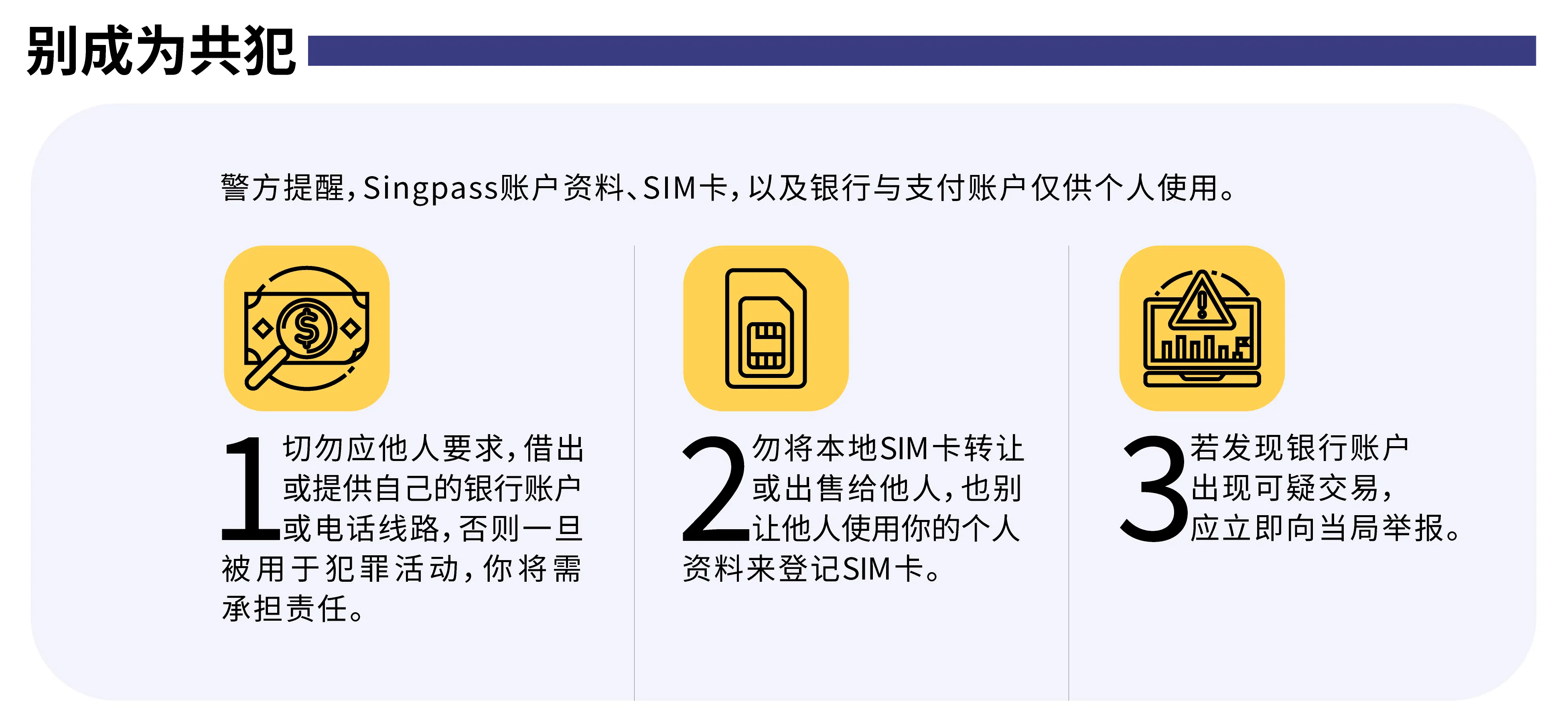 从今年10月起,在接受调查期间仍有可能继续协助诈骗的钱骡,可能被禁止登记新的电话线路,他们的银行账户及Singpass使用权限也可能受到限制。