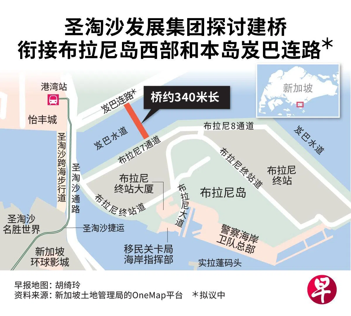 纳入布拉尼岛的圣淘沙重新发展总体规划有了具体的新计划,圣淘沙发展局正探讨建一座新桥,并启用全新的旅客捷运系统,将布拉尼岛西部与本岛的岌巴码头一带连接起来,促进人流往来。