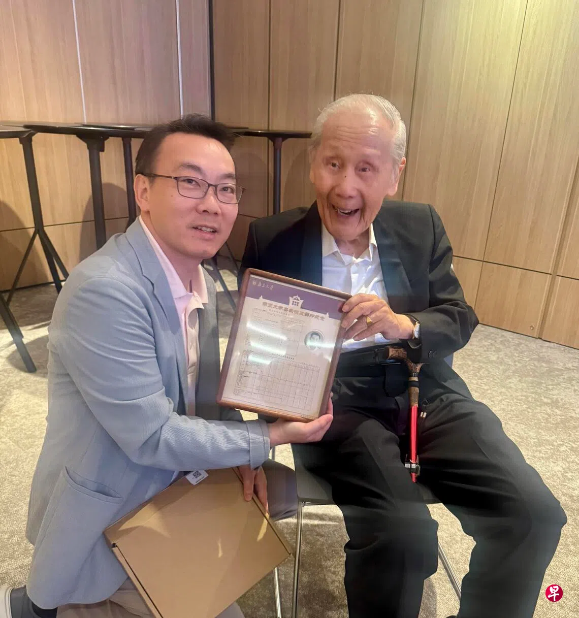 新加坡江苏会会长周兆呈说,这块影印纪念相框,是南京大学副校长索文斌率团今年5月来新加坡时特意带来的,王赓武当时因故出国,所以托他转交。