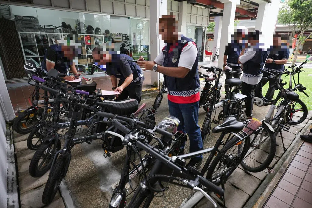 在一座组屋底层,执法人员检查六辆通勤工具,其中有电动脚踏车被改装成电单车的样子。执法人员随后到不同楼层的走廊,查看是否有不合规的通勤工具。
