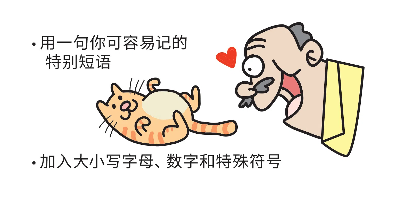 用一句特别的短语,并加入大小写字母、数字和特殊符号,创造一个自己容易记、别人难猜到的密码。