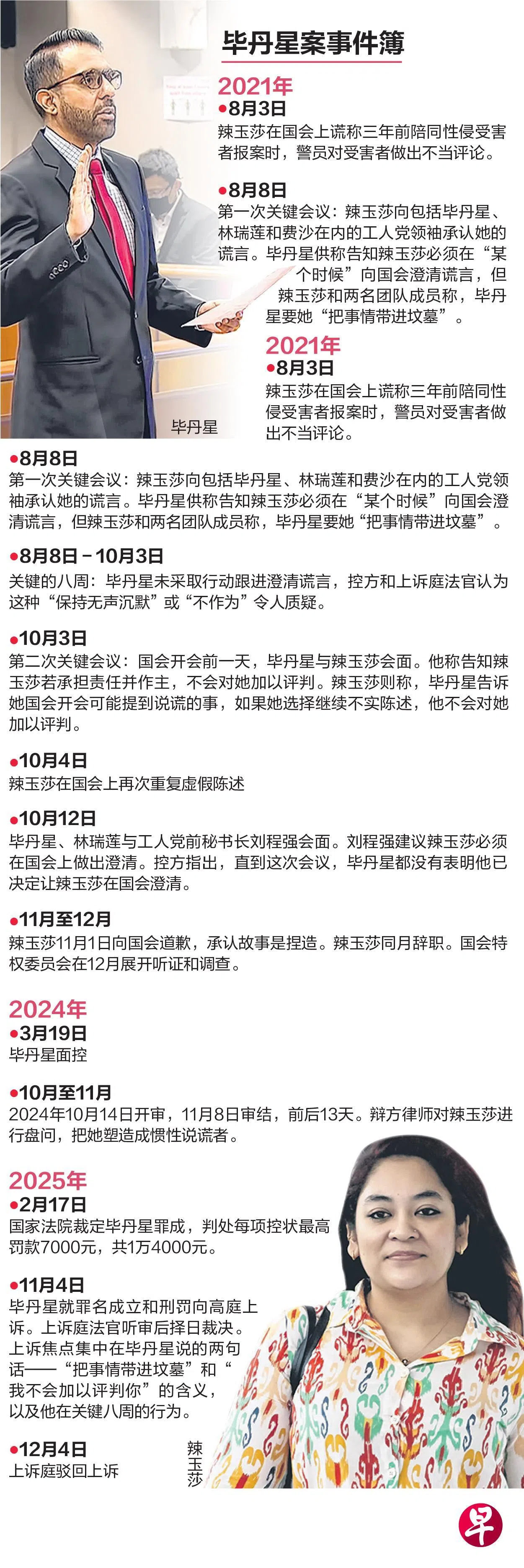 法官进一步指出:“上诉人(毕丹星)从8月8日至10月3日期间,完全未向辣玉莎本人或党内其他领导继续跟进这事,充分印证了他在8月8日那场会议中的确说过‘把事情带进坟墓’,也认定并不需要对辣玉莎向国会发表了不实说法主动澄清。”