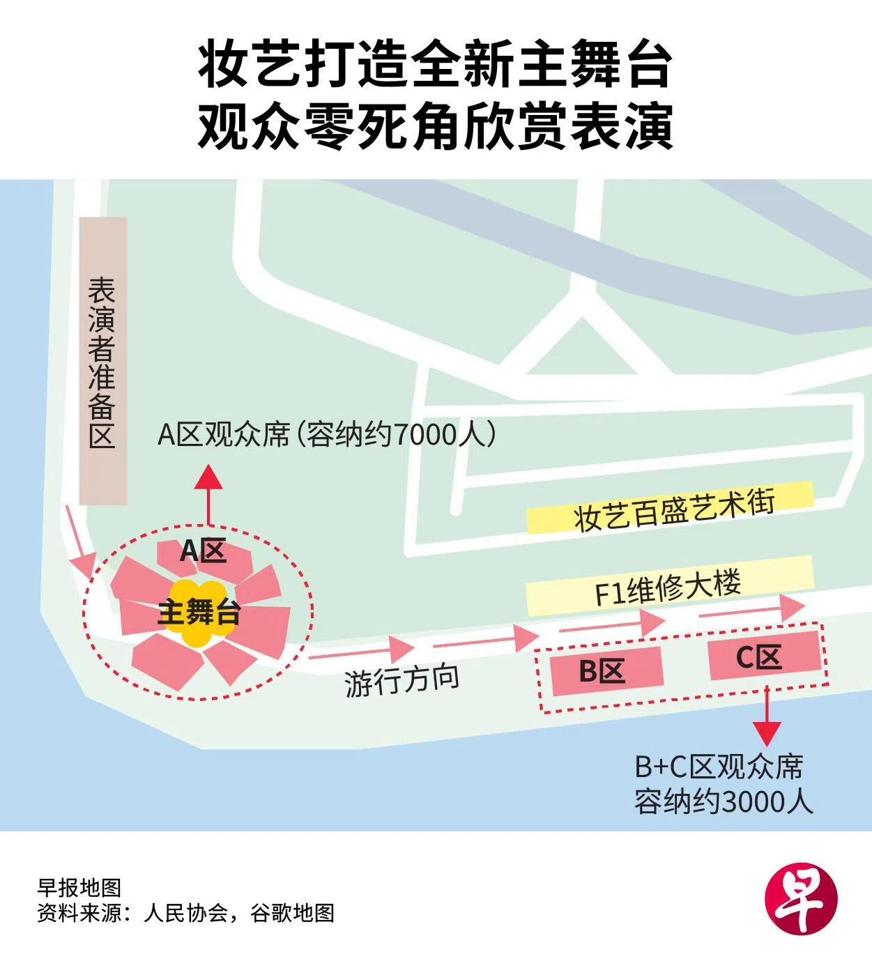 采用圆形主舞台是这届妆艺的重大调整,这将改变持续了50多年来的直线表演形式。游行表演按圆圈形式进行,让现场观众有360度的观赏体验。“圆”也是凝聚力和团聚的象征,符合喜庆。