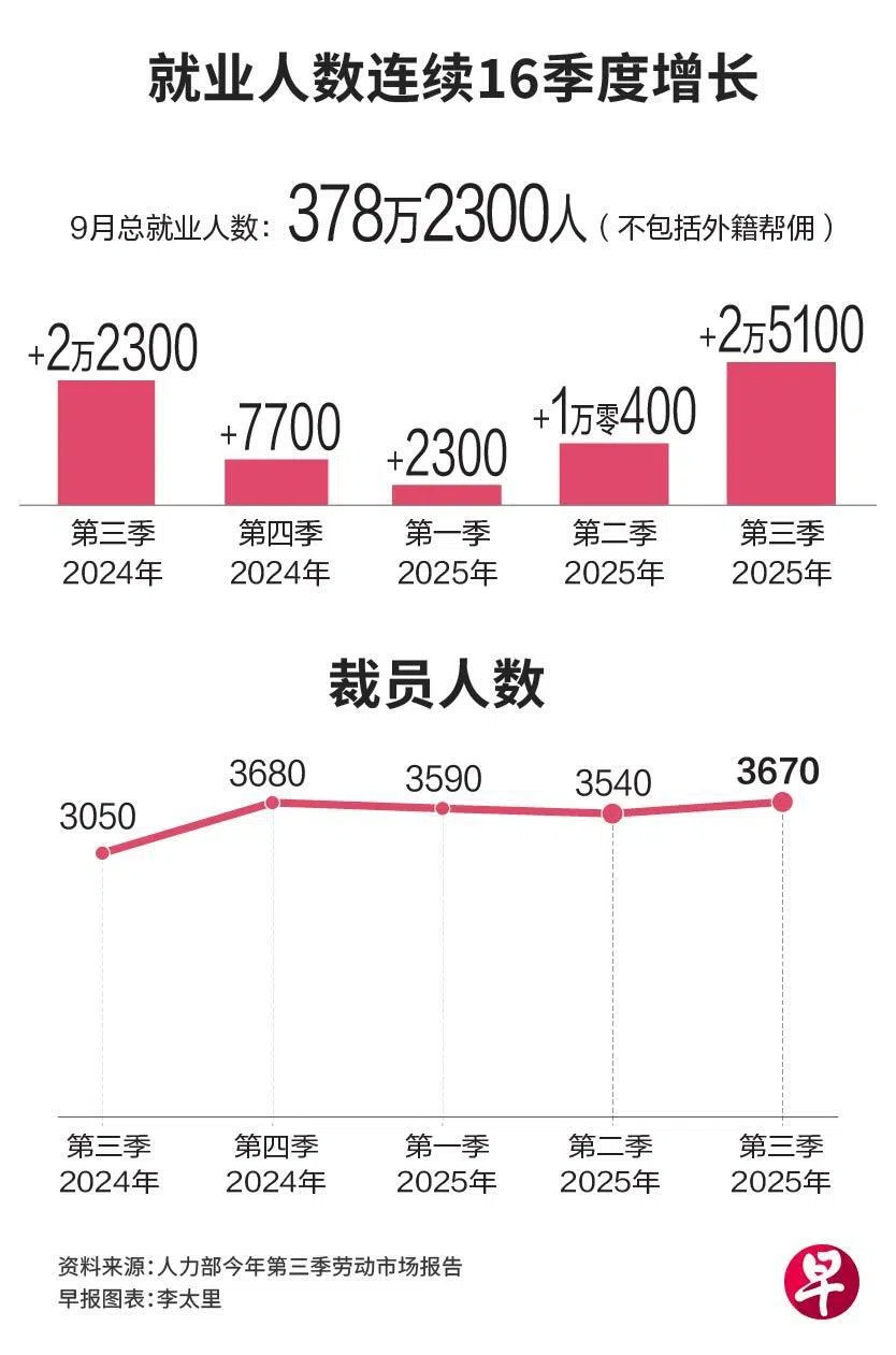 我国经济持续向好,推动劳动力市场连续16个季度增长。不包括外籍帮佣,今年第三季就业人数增加2万5100人,比早前的预估数据略多;与前个季度的1万零400人相比则是倍增。