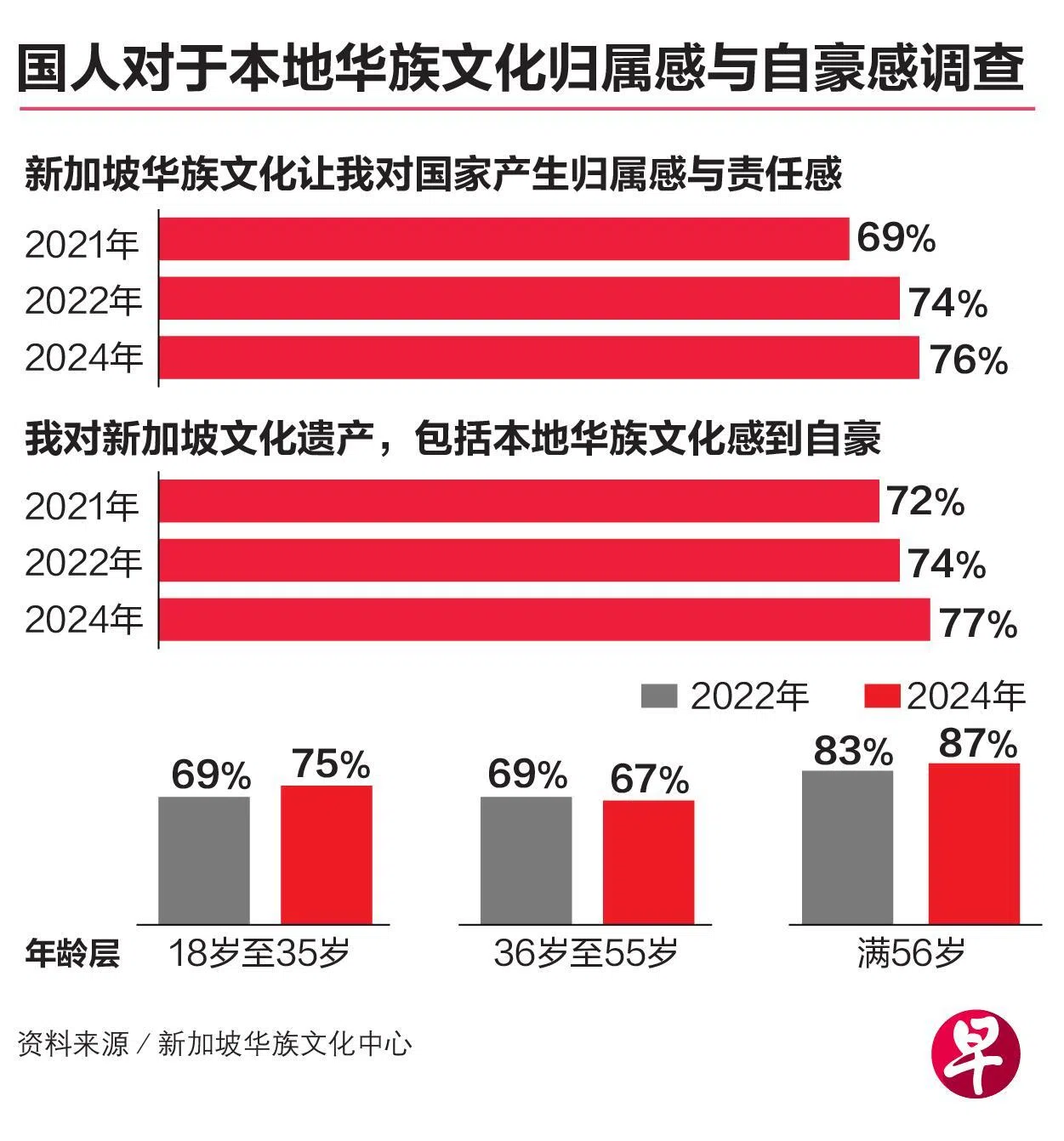 调查显示,新加坡华人对本地华族文化的自豪感与归属感过去四年持续上升,对本地华族文化感到自豪的占比,从2021年的72%升至2022年的74%,再到2024年的77%;因本地华族文化对国家产生归属感与责任感的占比,则从2021年的69%升至2024年的76%,提高七个百分点。