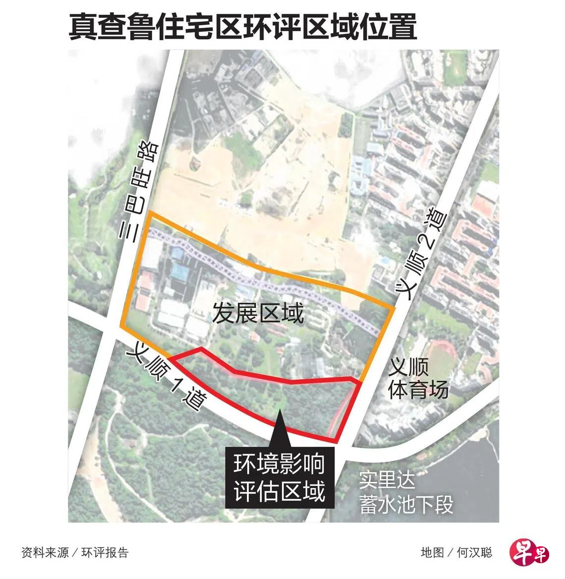 这个环评针对的范围是义顺1道和三巴旺路交界处、紧靠着原生园(Orto)义顺旧址的一块七公顷的绿地。这个区域占整个真查鲁(Chencharu)规划区约10%,已规划为住宅和综合设施用地。