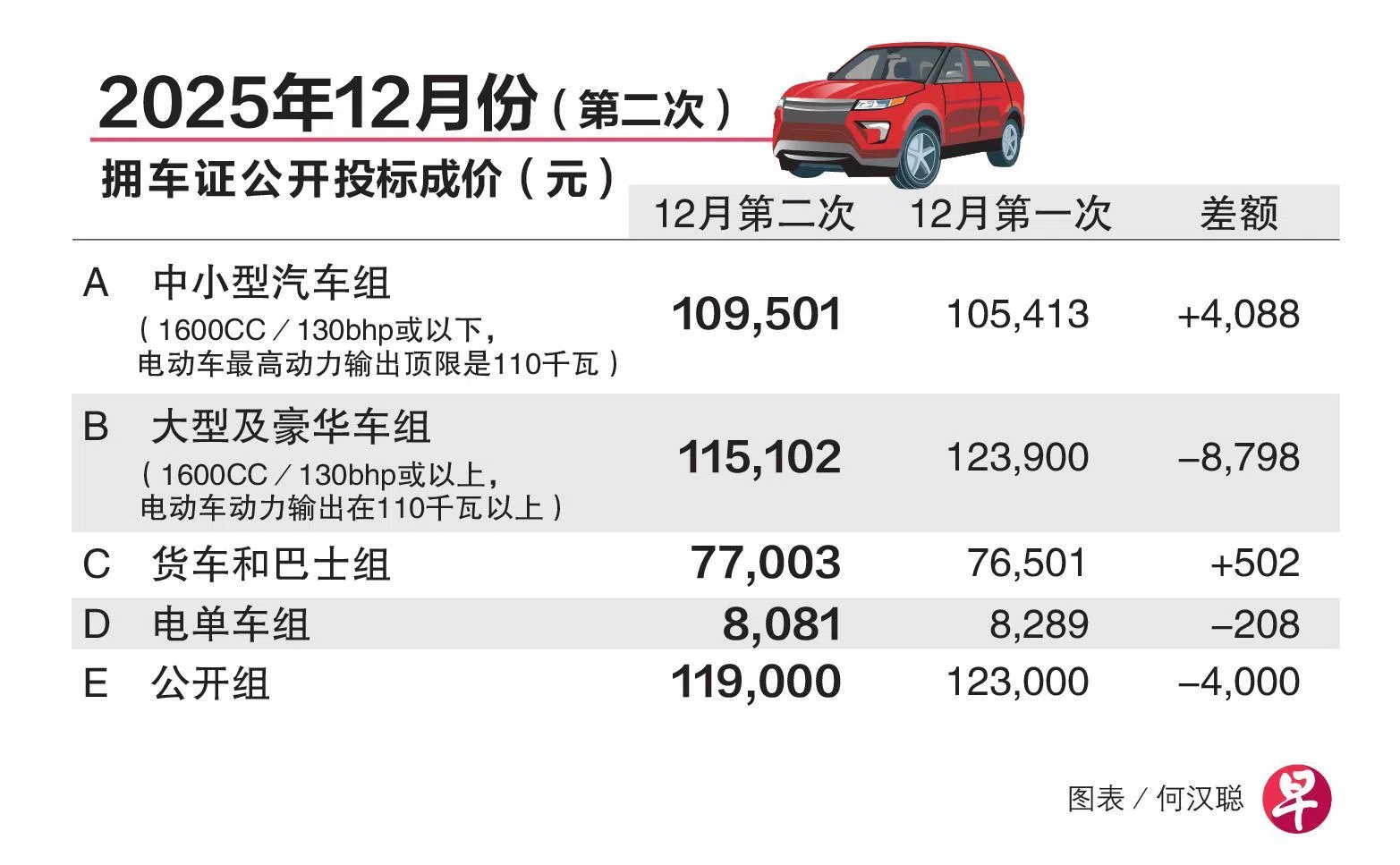 今年最后一轮拥车证公开投标活动星期三(12月17日)下午结束,应对大众市场需求的中小型汽车组(A组)成价回升4088元(3.88%),报10万9501元。