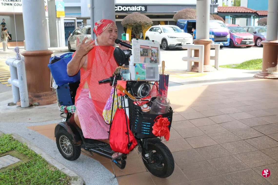 于是,裕廊一带的小贩中心旁,多了一个电动代步车上献唱的身影。罗任达选在西部几个小贩中心边,每周定时表演唱歌。和当年唱歌演出一样,罗任达仍不满足于只唱歌,而是发挥造型师的特长,为自己做各式各样的表演服。