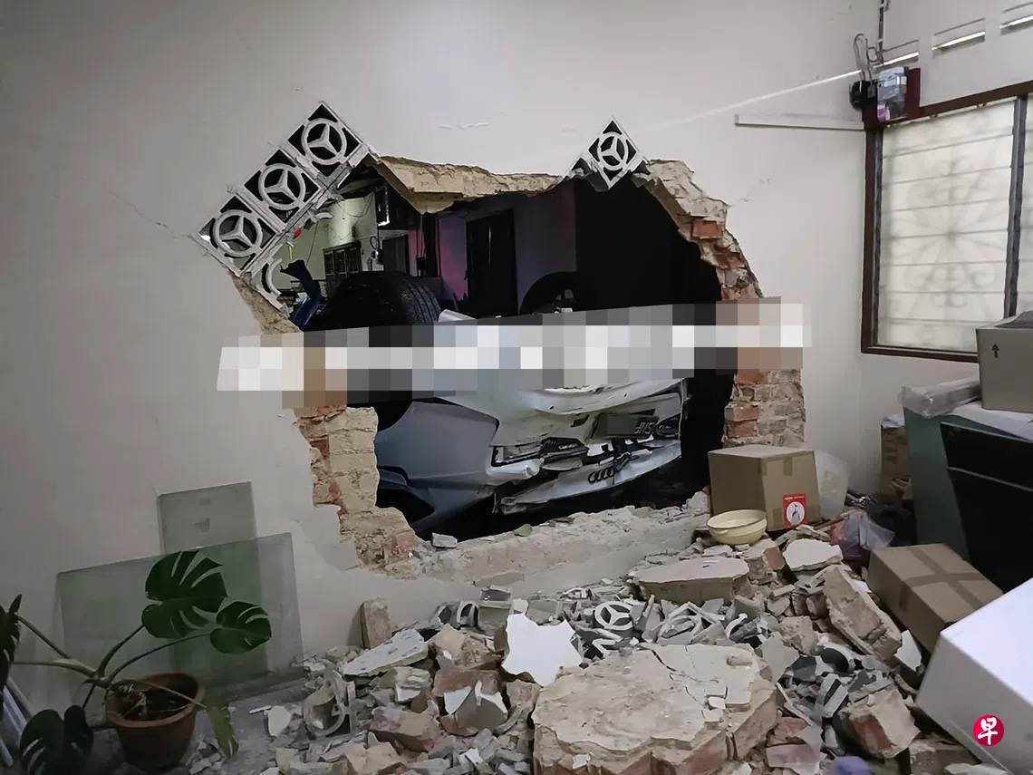 狮城奥迪汽车凌晨失控,猛撞新山排屋,波及五间住宅,撞断一根柱子,撞毁三面墙,其中一面墙撞出一个大洞。