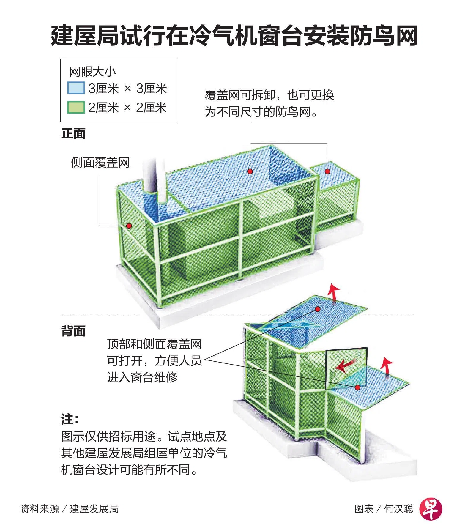 文件指出,防鸟网的网状结构必须采用2厘米乘2厘米的网眼设计,顶部覆盖网的网眼尺寸则介于2厘米至5厘米,并可在试点期间做出调整。