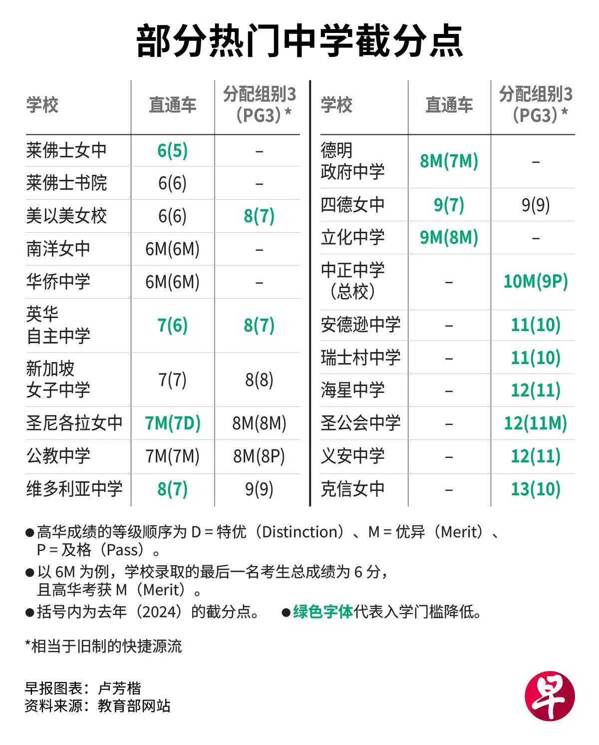 不过,一些直通车学校还是维持了去年的高门槛。《联合早报》对比20所热门中学2024年和今年的截分点后发现,莱佛士书院、华侨中学和南洋女子中学校等中学的截分点和去年相同。