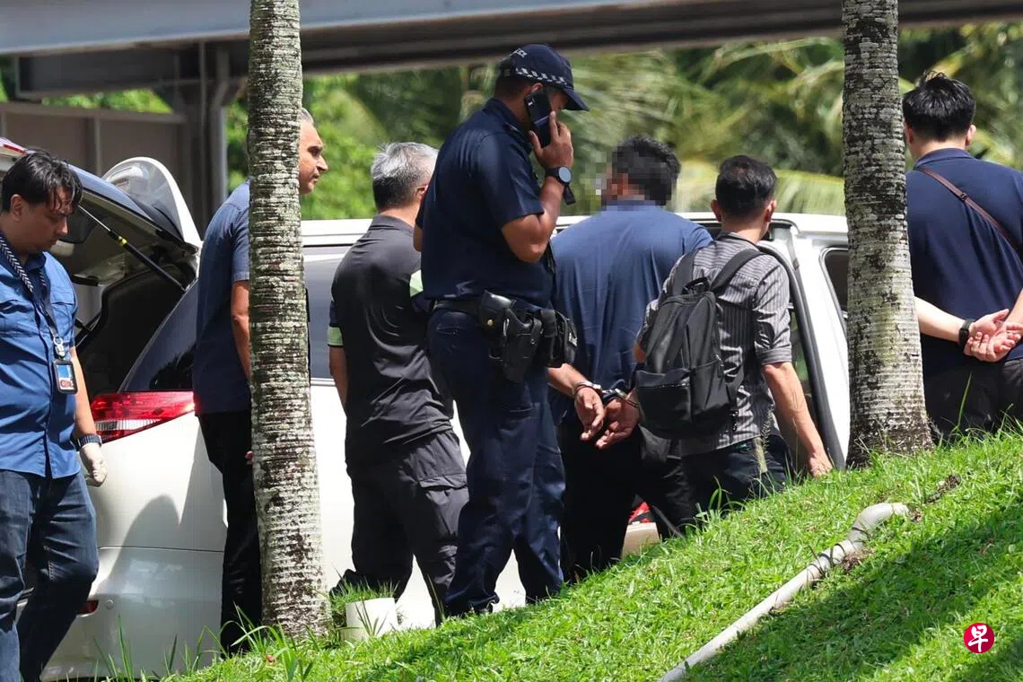 《联合早报》记者现场采访时发现,一名男子约下午1时50分戴着手铐,被警方带到一辆停在教堂停车场的白色车辆展开调查。大约半小时后,男子便被警方押上车离开教堂。