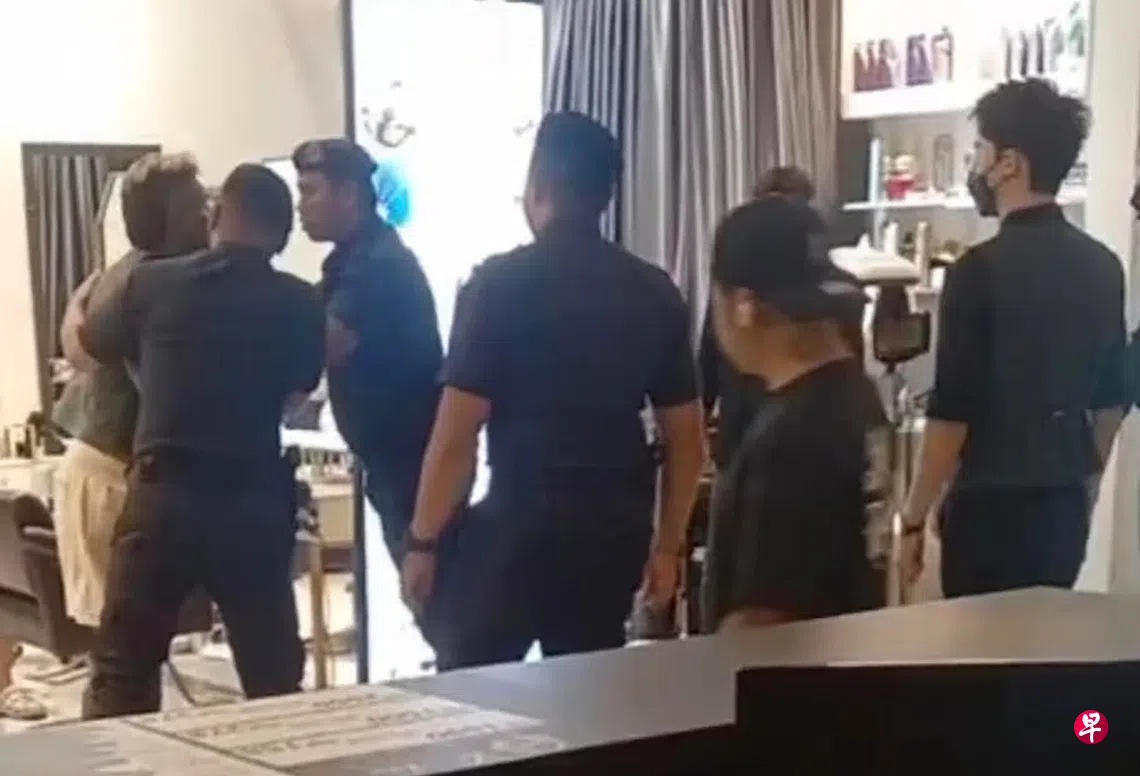 两人缠斗至一间美发院内,双方继续挥拳,旁边还能听到一名女子不断喊着:“哈罗!哈罗!”,试图阻止两人。