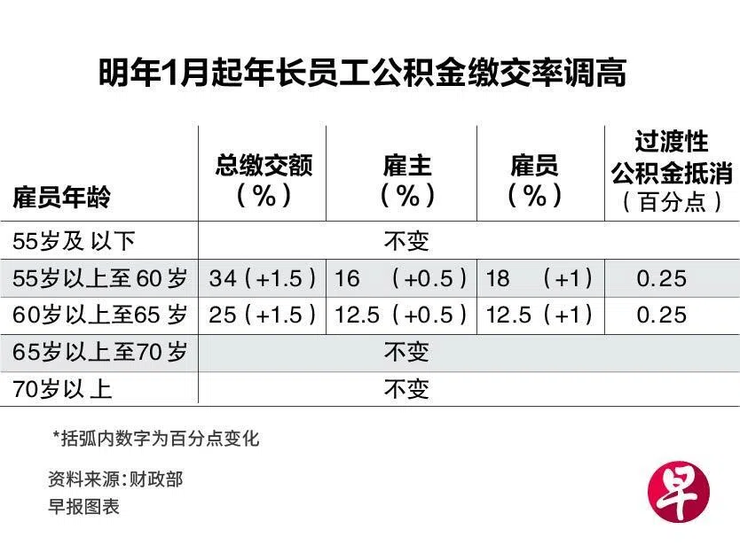 55岁至65岁员工的公积金总缴交率提高1.5个百分点,每月增加的缴款将存入退休户头,除了可享有较高利率,日后也可获得较多的每月入息。