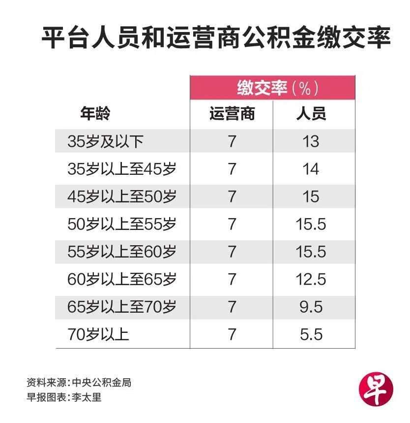 自《平台人员法令》在今年1月生效以来,1995年1月1日后出生的平台人员,须额外缴交公积金;1995年1月1日前出生的平台人员,则可自行选择是否要额外缴交公积金。明年起平台运营商须承担的缴交率,会增至7%;平台人员缴交率则视年龄而定,从5.5%至15.5%不等。