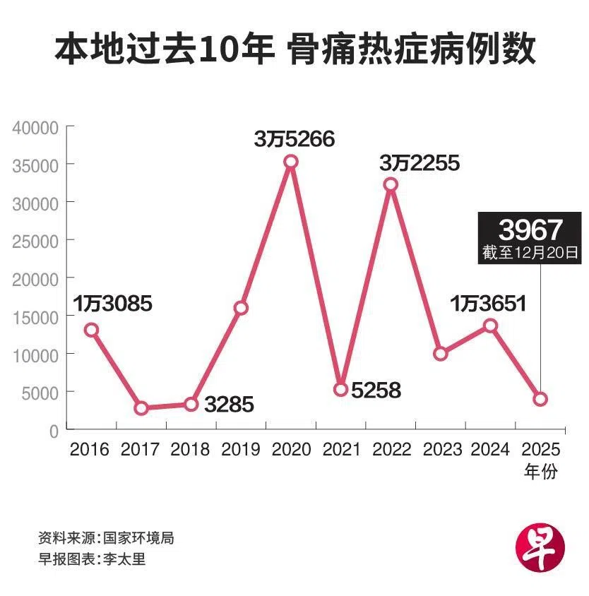 环境局星期二(12月23日)在官网发布的数据显示,截至上周六(12月20日),今年通报3967起骨痛热症病例,是2018年以来的新低。过去10年,2020年和2022年的病例较多,分别为3万5266起和3万2255起;最低则是2017年的2767起。