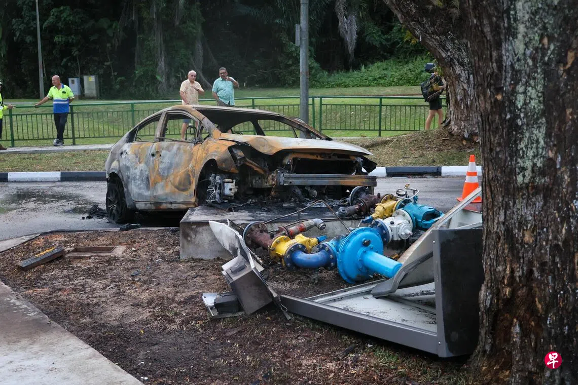 《联合早报》记者抵达车祸现场时,火势已被扑灭,警方在现场指挥交通。