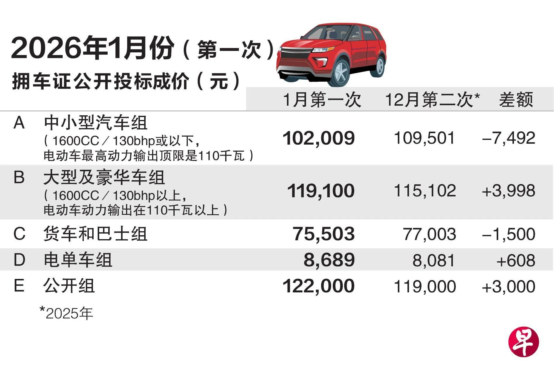 今年首轮拥车证公开投标活动星期三(1月7日)下午结束,中小型汽车组(A组)成价下跌7492元(-6.84%),报10万2009元。