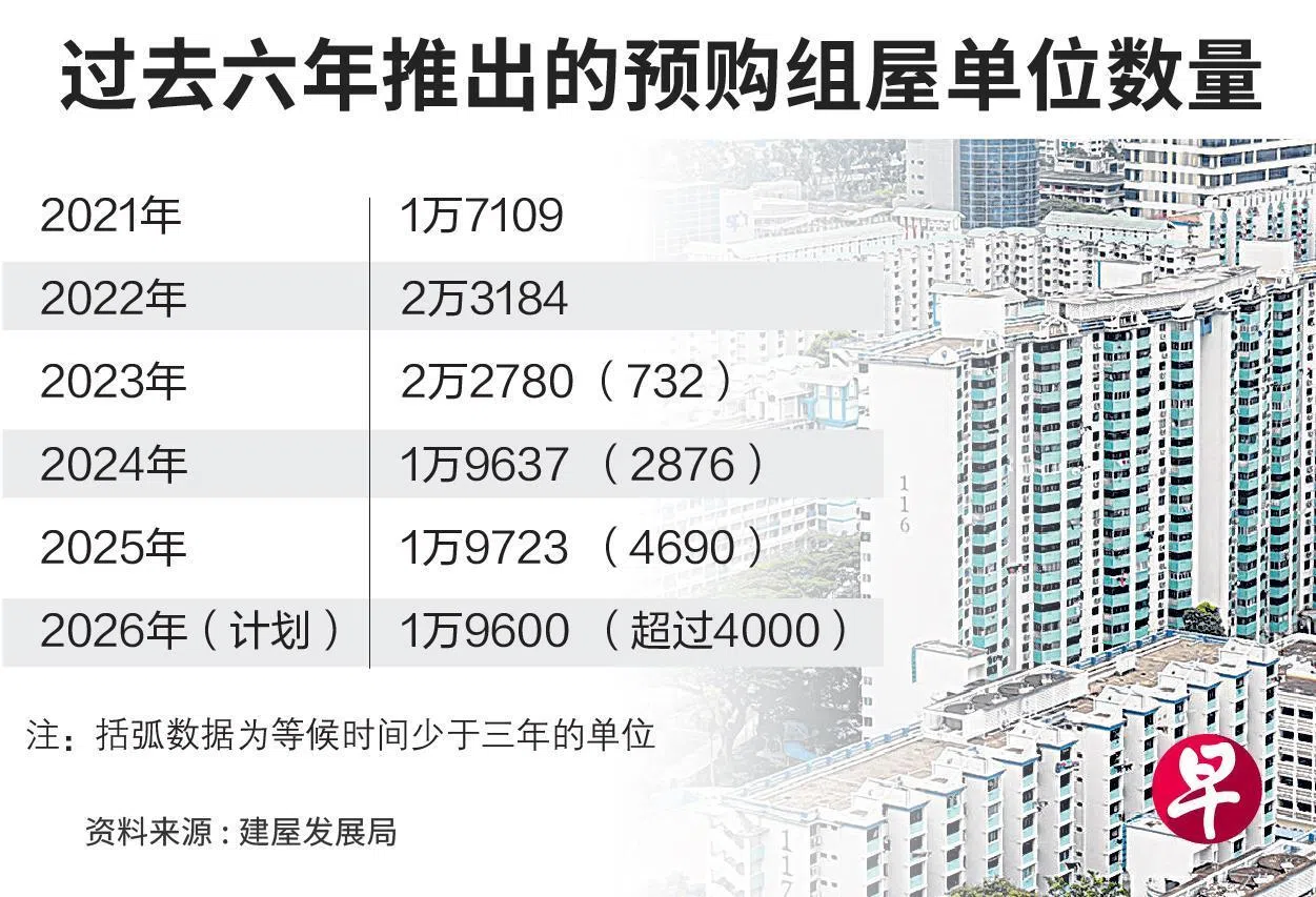建屋发展局今年将推出约1万9600个预购组屋单位,比去年略少100多个,其中超过4000个(约20%)的等候时间将少过三年。