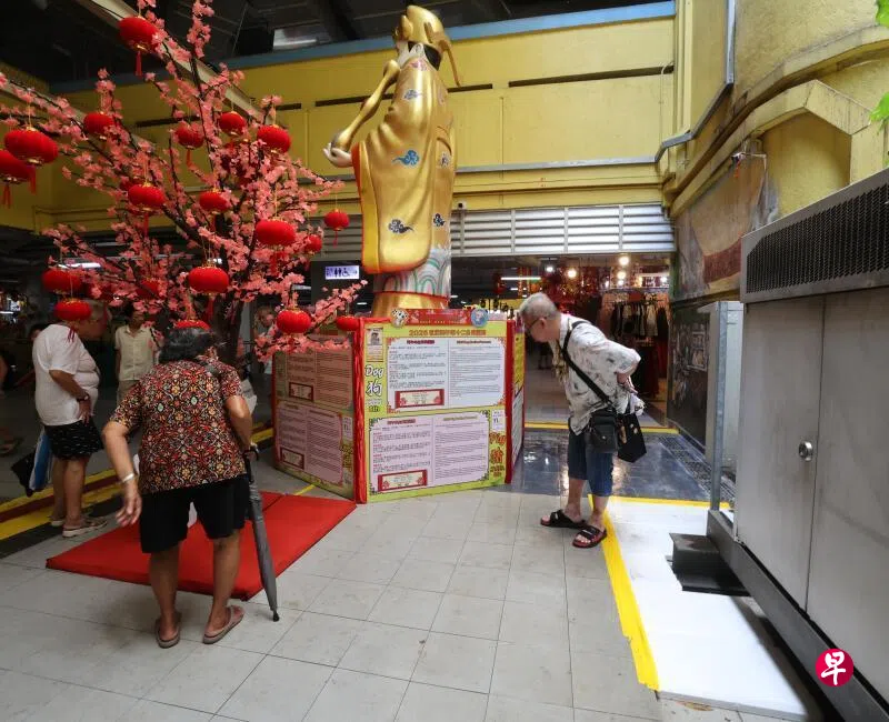 牛车水大厦一楼的财神像与生肖运程吸引不少公众围看,但刚设立一天就有公众因四周地面不平摔倒,商联会急忙“填坑”、放警示锥防范。