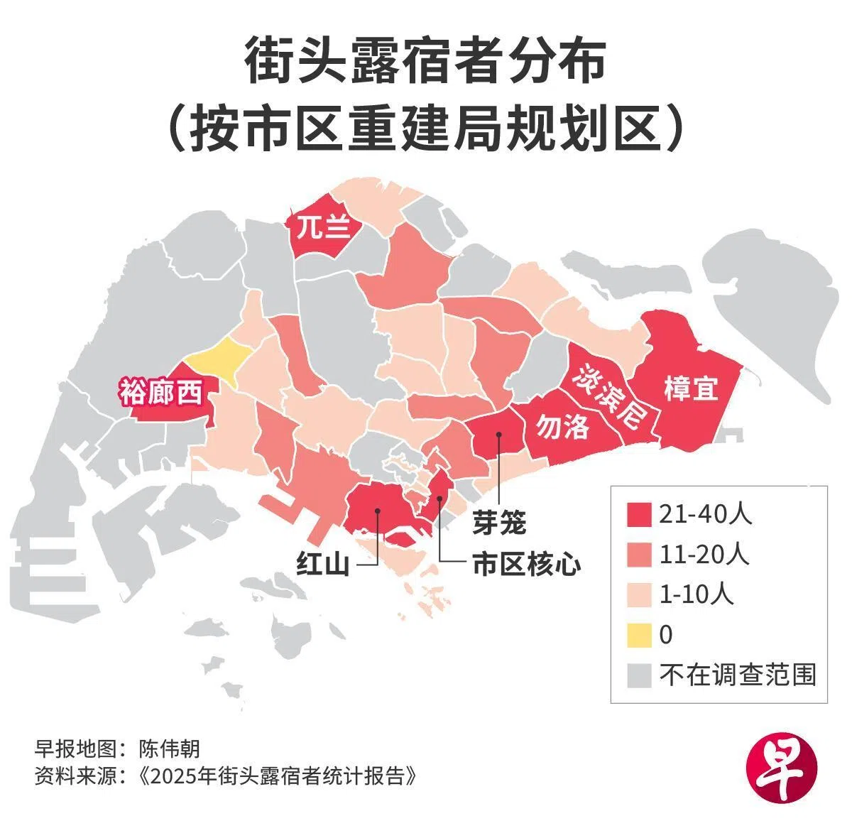 政府的《2025年街头露宿者统计报告》显示,在红山、裕廊西和勿洛露宿的人最多。