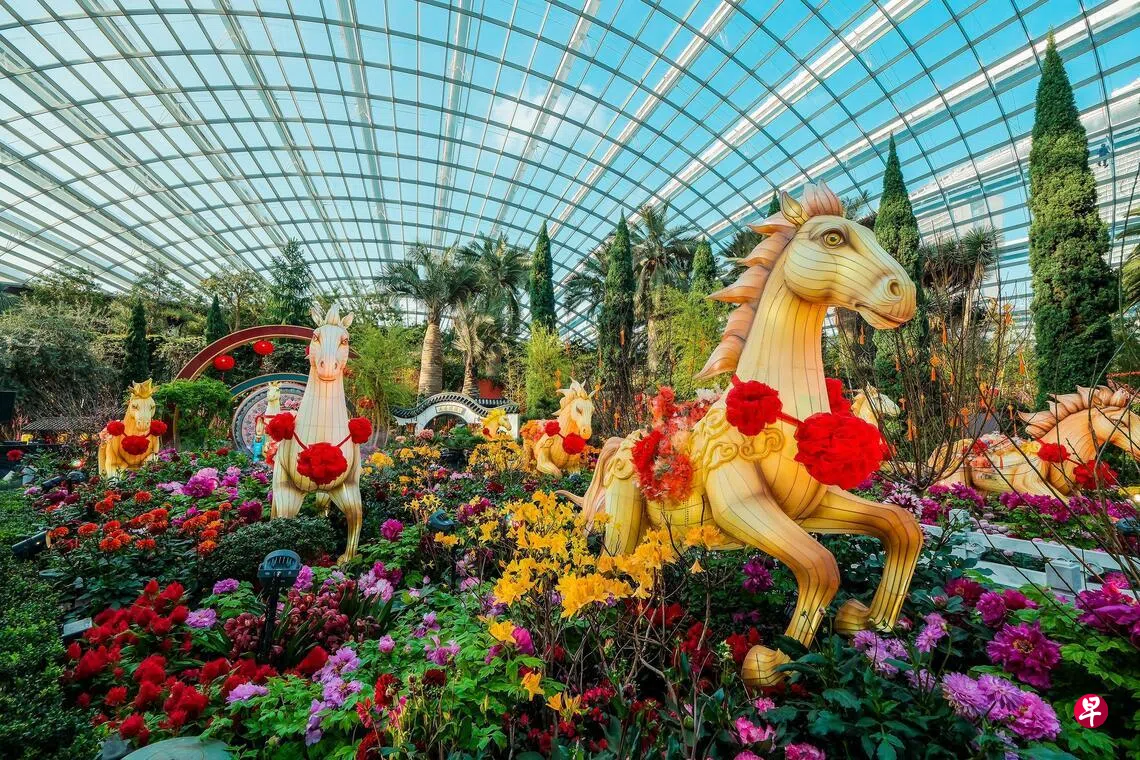 滨海湾花园花穹正举行“春花盛开之骏马奔腾”花卉展,准备迎接农历新年的到来。访客可观赏八盏采用千年传统工艺打造、大小比例接近真马的精美骏马花灯。花展使用的超过1万株植物中,以“花中四君子”——梅、竹、兰、菊最为突出,为新年增添雅致气息。