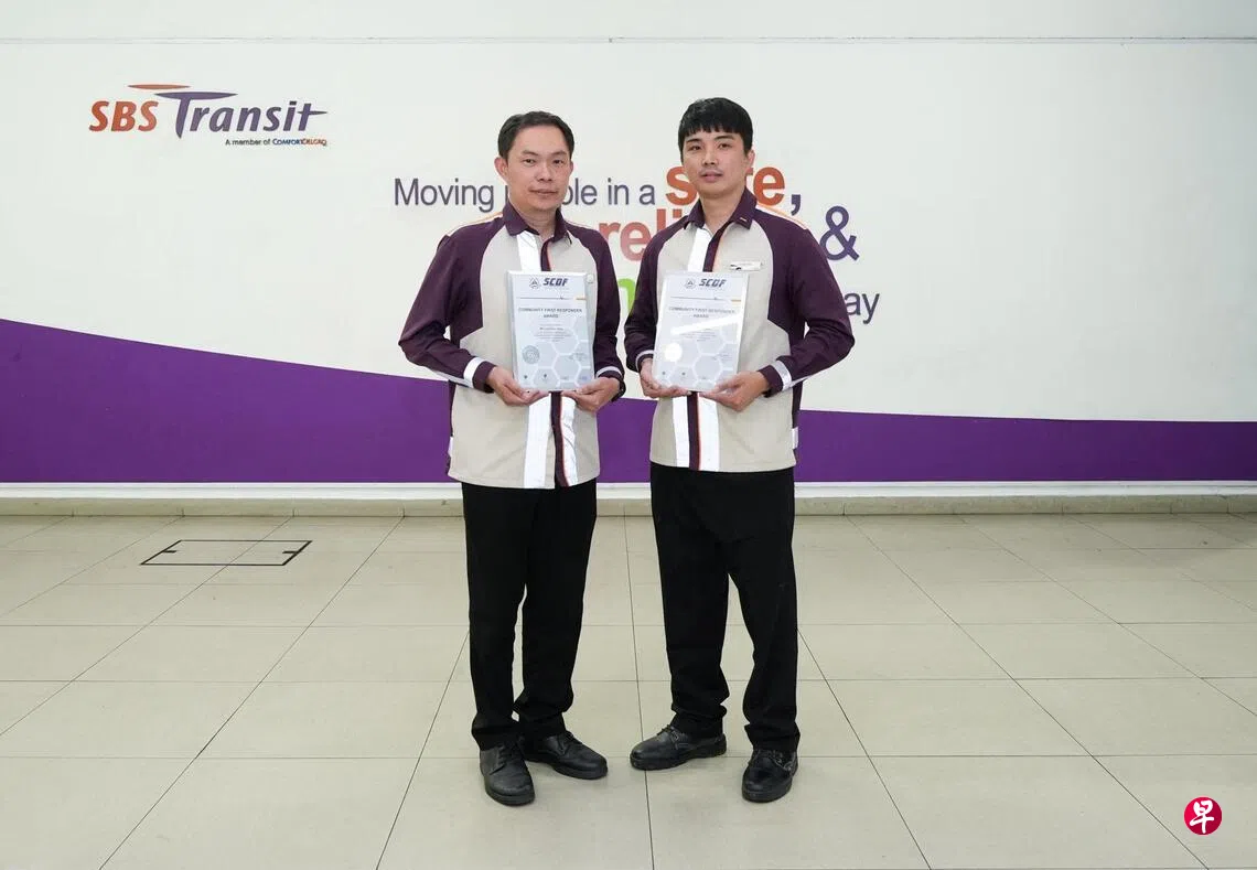 两名新捷运巴士车长林瑞盛(35岁)与刘宝财(49岁)上星期五(16日)在新捷运位于实里达一带的车厂获民防部队颁发社区援救者奖。