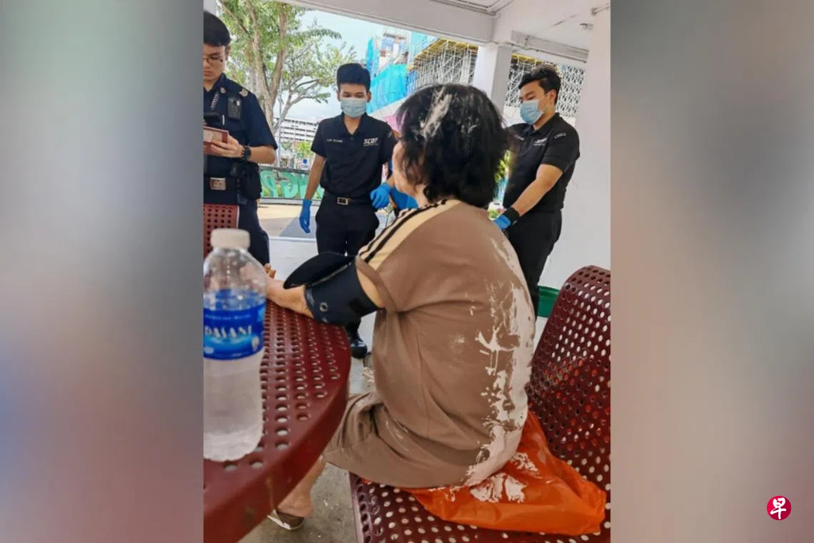 根据潘先生提供的现场照片显示,阿嫂的头发、身体、双腿甚至脚部,都沾染大片白漆。新加坡民防部队的医护人员随后也到场,为阿嫂检查伤势并测量血压。从照片可见,现场也有几名警员,相信也是接到通报后赶来协助。